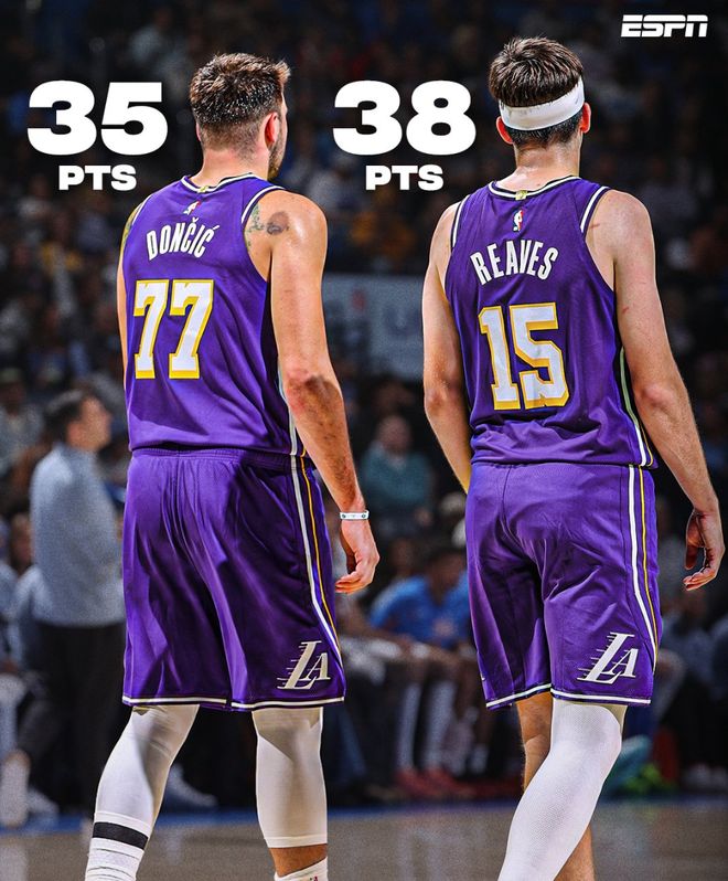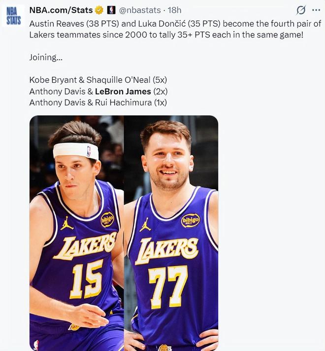 东契奇/里夫斯也加入2000年后科比/奥尼尔5次双35+,詹姆斯/浓眉两次双35+,浓眉/八村一次双35+(这场比赛勒布朗没打),勒布朗还差一个月就年满41岁了,他真的打得非常轻松,因为他减少了持球,他更多是无球、接球出手。