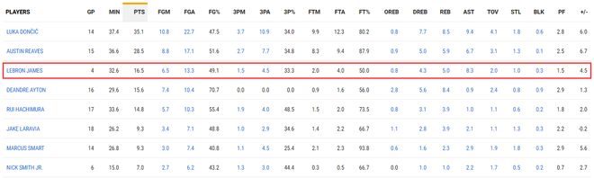 目前老詹四场比赛场均只有32.6分钟,拿到16.5分8.3助攻5篮板1抢断0.3盖帽,命中率49.1%,三分命中率33.3%,这就是一个角色球员的数据,他更多的充当组织者、下快攻手的角色,而且组织者的身份还更多是在东契奇下场休息时。