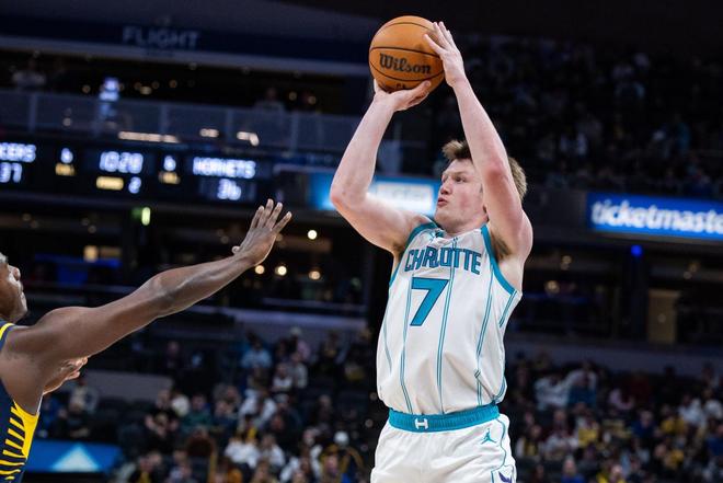 而历史级的投篮能力,则是他破局的核心武器。克尼佩尔仅用58场比赛就命中201记三分,刷新NBA历史最快200记三分纪录,比原纪录保持者邓肯·罗宾逊快11场,同期表现远超库里、克莱等传奇射手的新秀赛季。他的三分投射覆盖全场,底角三分命中率高达46.2%,持球投三分命中率更是达到恐怖的50%,即便面对高强度防守也能保持稳定输出。更难得的是,他将投篮威胁转化为团队增益,其外线牵制迫使对手扩大防线,为队友创造了更多突破和内线进攻机会,当他与三球、米勒同时在场时,黄蜂每百回合能轰下128分,进攻效率稳居联盟前列。