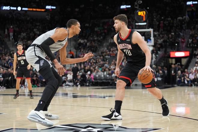 马刺的首发阵容是文班亚马+四射手配置,虽然卡斯尔本赛季的三分投射并不准,但是卡斯尔并不是完全不能投,火箭的首发阵容依旧是阿门+申京两位没篮拒投的配置,乌度卡依旧认死理。