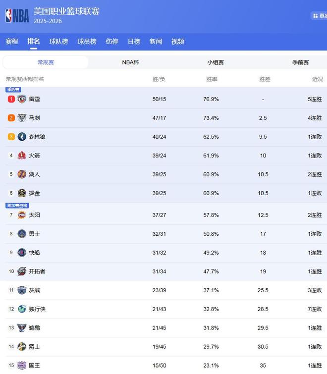 西部最新排名: