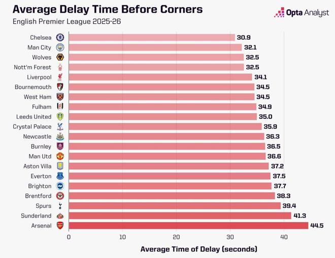 阿森纳59次的拖延次数,显然和1851秒的总拖延时长直接相关。平均下来,他们每次从角球、球门球、界外球和任意球重新开球,需要耗时31.4秒。而在2025-26赛季英超中,共有195次球队重新开球的平均用时超过这一数字。