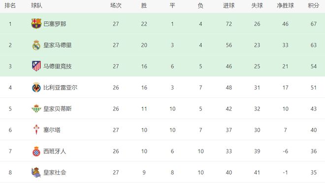 在积分榜上,巴萨排名榜首。巴萨战绩是22胜1平4负,拿到67分。而只拿到63分的皇马排名第2,落后巴萨4分。马竞赢球之后,总积分达到54分,排名第3,与身前的两支球队差距依然很大。比利亚雷亚尔以51分排名第4。第5的是皇家贝蒂斯,拿到了43分。